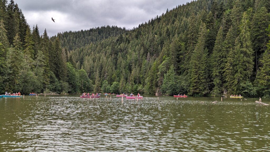 Lo que sí que vimos fue por lo que es más famoso: por los troncos que salpican la superficie. Y es que el Lago Rojo se formó hace casi 200 años tras un desprendimiento de tierra que bloqueó el cauce del río Bicaz, sepultando un bosque entero.